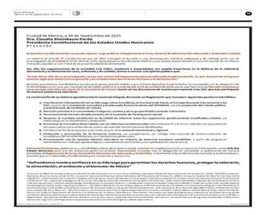 Desplegado de prensa – La Jornada – 30 de septiembre – 2025 – p.13 Una de nuestras principales demandas como Campaña Nacional Sin Maíz No