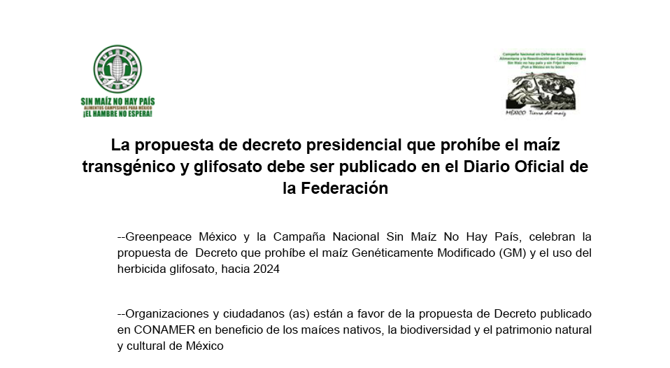 La organización ambientalista Greenpeace México y la Campaña Nacional Sin Maíz No Hay País, celebramos la propuesta del decreto presidencial en el que se prohíbe el maíz transgénico en México y que marca la ruta para eliminar, hacia el 2024, el uso del glifosato en territorio nacional, y urgimos al presidente de México, Andrés Manuel López Obrador, para que firme y se publique en el Diario Oficial de la Federación.